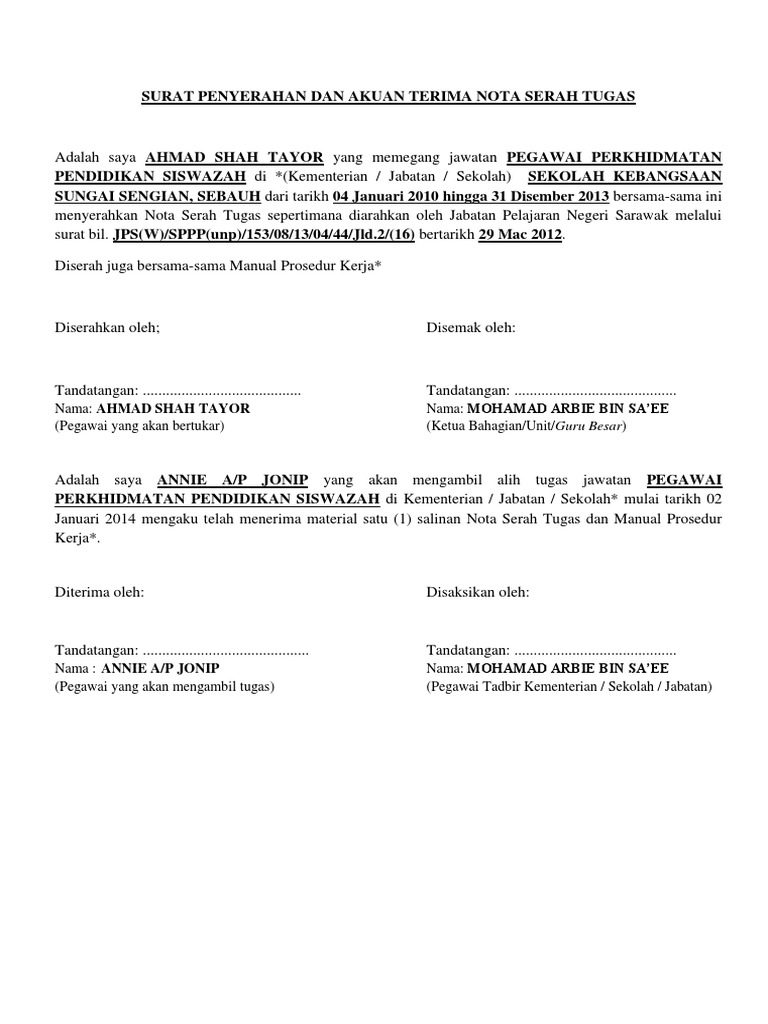 Surat Serahan Tugas - Surat Penyerahan Dan Akuan Terima Nota Serah Tugas - Jan 05, 2016 · pantun alam remaja dimuatkan pada muka surat 5 dan 6 naskhah antologi 'baik budi, indah bahasa'.